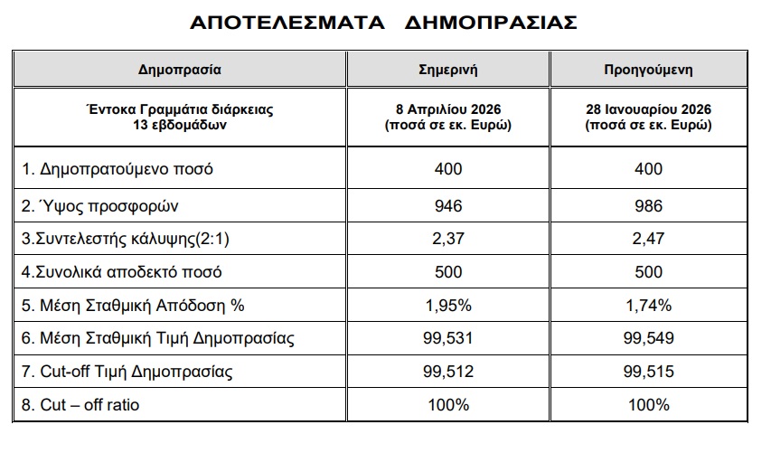 - Διαδικασία & όροι: Η δημοπρασία πραγματοποιήθηκε μέσω Primary Dealers, με διακανονισμό στις 14 Απριλίου 2026 και χωρίς προμήθεια συμμετοχής.