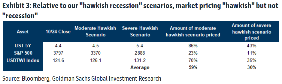 Κανένα από τα αμερικανικά περιουσιακά στοιχεία που παρακολουθεί η Goldman Sachs δεν ενσωματώνει πλήρως στην αποτίμησή του την πιθανότητα ύφεσης, με τις μετοχές να συνυπολογίζουν απλώς ένα «σοβαρό hawkish σενάριο». Οι απόψεις των αναλυτών της Goldman Sachs διαφέρουν από εκείνες της Citigroup Inc. και της JPMorgan Chase & Co., οι οποίοι είπαν ότι η πτώση στις αγορές υποδηλώνει ότι η ύφεση είναι ήδη εδώ.