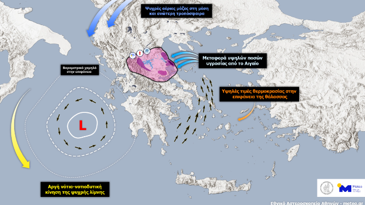 – Οι ψυχρές αέριες μάζες στη μέση και ανώτερη τροπόσφαιρα σε συνδυασμό με την επικράτηση θερμών και υγρών αερίων μαζών στην κατώτερη ατμόσφαιρα, συνέβαλαν στην ανάπτυξη έντονης ατμοσφαιρικής αστάθειας πάνω από την περιοχή μας και τη δημιουργία εκτεταμένων καταιγίδων. Αν και η παρουσία της Ψυχρής Λίμνης και του Ωμέγα εμποδιστή δεν είναι πρωτοφανή φαινόμενα, η επικράτηση υψηλών τιμών θερμοκρασίας στην επιφάνεια της θάλασσας και στον υπερκείμενο αέρα αυτή την περίοδο του έτους συνέβαλε στην έντονη ατμοσφαιρική αστάθεια, που αναπτύχθηκε στην ευρύτερη περιοχή του Αιγαίου.