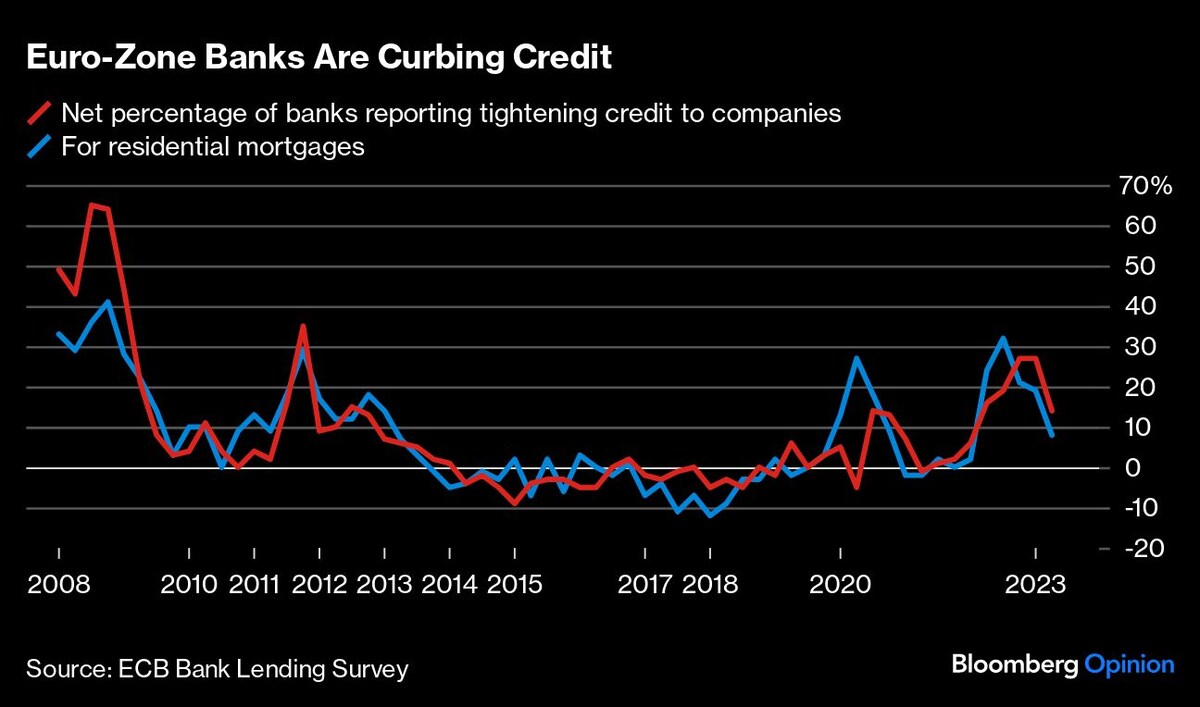Τώρα, το αν η ΕΚΤ κάνει εκ νέου αύξηση τον Σεπτέμβριο, είναι προς συζήτηση. Ωστόσο, ακόμη και μια παύση δεν σημαίνει ξαφνικό τέλος στην απόσυρση των νομισματικών κινήτρων. Σωρεύοντας τη μιζέρια που επικρατεί, η τριμηνιαία έρευνα της ΕΚΤ για τον τραπεζικό δανεισμό που δόθηκε στη δημοσιότητα την Τρίτη έδειξε περαιτέρω αυστηροποίηση των πιστωτικών όρων για τα νοικοκυριά και τις επιχειρήσεις. Η ζήτηση για επιχειρηματικά δάνεια μειώθηκε σε ιστορικά χαμηλά επίπεδα – κάτι που προμηνύει άσχημα μαντάτα για τις εταιρικές επενδύσεις και αποτελεί προειδοποιητικό καμπανάκι για τους επενδυτές.