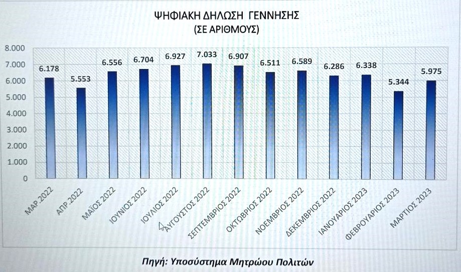 Στο γράφημα φαίνονται οι ψηφιακές δηλώσεις γέννησης κατά το χρονικό διάστημα Μαρτίου 2022 – Μαρτίου 2023.