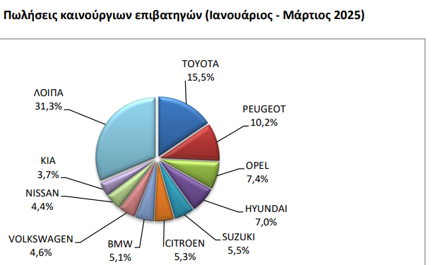 Η εταιρεία με τις περισσότερες πωλήσεις καινούργιων επιβατηγών στην Ελλάδα ήταν η Toyota (15,5%), ακολουθούμενη από την Peugeot (10,2%) και την Opel (7,4%) επί του συνόλου των πωλήσεων.