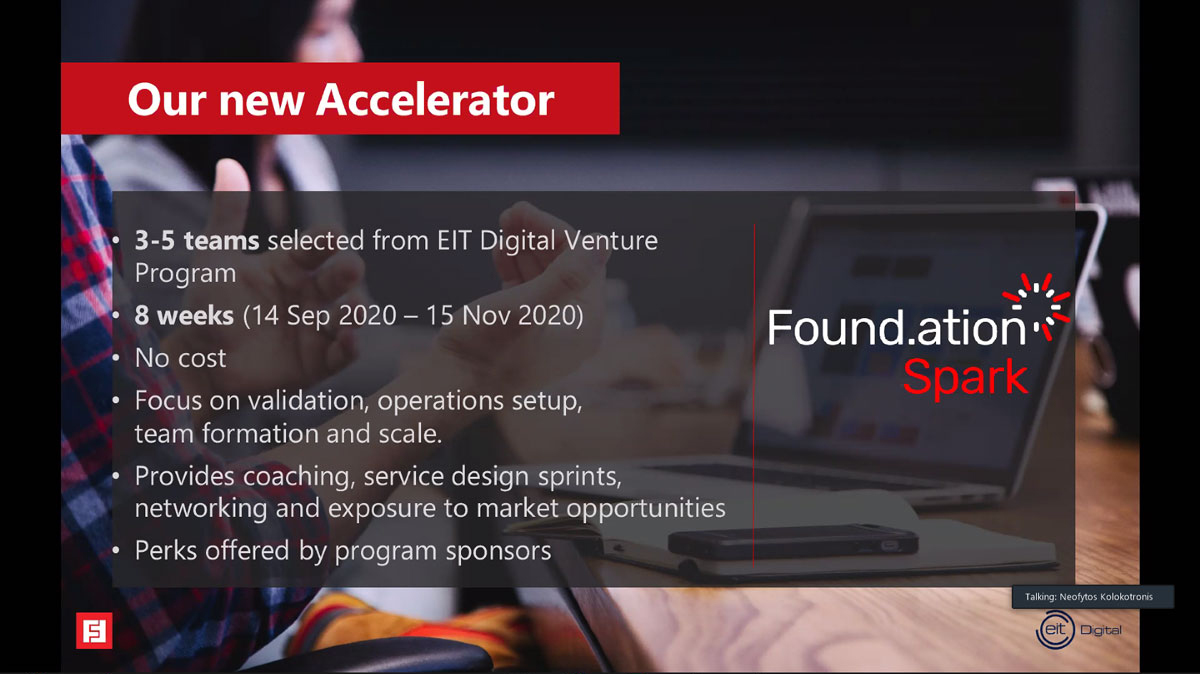 Τέλος, κατά τη διάρκεια της Demo Day ανακοινώθηκε και ο νέος accelerator του Found.ation: Tο Found.ation Spark έχει ως στόχο να δώσει περαιτέρω ώθηση, στήριξη και καθοδήγηση σε επιλεγμένες ομάδες που θα αποφοιτήσουν από το EIT Digital Venture Program, γεφυρώνοντας το κενό που προκύπτει από τη σύστασή τους μέχρι τη στιγμή που θα είναι έτοιμες να διεκδικήσουν την πρώτη τους σημαντική χρηματοδότηση από επενδυτές. Το πρόγραμμα δεν έχει κανένα κόστος για τις ομάδες. Περισσότερες λεπτομέρειες για τα οφέλη και τους συνεργάτες του Found.ation Spark θα ανακοινωθούν σύντομα στη σχετική ιστοσελίδα.