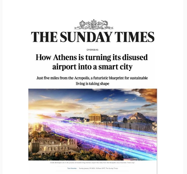 «Μόλις οχτώ χιλιόμετρα από την Ακρόπολη, ένα φουτουριστικό σχέδιο για ένα βιώσιμο τρόπο ζωής παίρνει σάρκα και οστά», αναφέρει η τελευταία έκδοση της «The Sunday Times» σε εκτενή αναφορά της για το μεγαλύτερο έργο αστικής ανάπλασης στην Ευρώπη, το Ελληνικό.