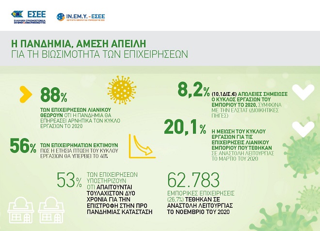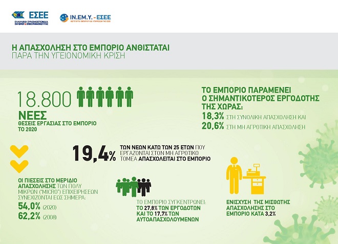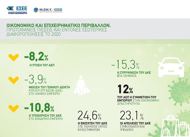Σύμφωνα με την Έκθεση για το 2020 ο κλάδος δέχεται ισχυρές πιέσεις από το οικονομικό και επιχειρηματικό περιβάλλον, αλλά διατηρεί την σημαίνουσα συμμετοχή του στην οικονομική δραστηριότητα (12% του ΑΕΠ) παραμένοντας παράλληλα ο κυριότερος εργοδότης της χώρας (18,3% στη συνολική απασχόληση). Ωστόσο, η πανδημία συνιστά ιδιαίτερη απειλή για τις εμπορικές επιχειρήσεις καθώς το 88% αυτών θεωρεί πως ο Covid-19 θα επηρεάσει αρνητικά τον κύκλο εργασιών, ενώ το 56% των επιχειρήσεων εκτιμά πως η πτώση του κύκλου εργασιών θα υπερβεί το 40%.