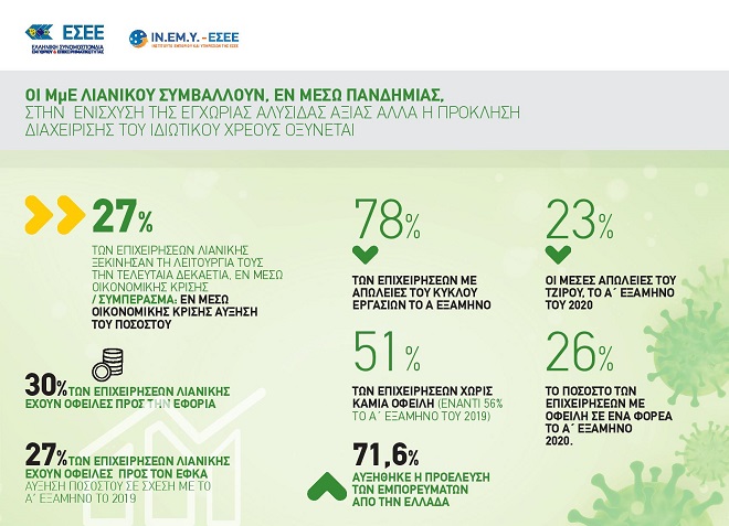 Σε αντίθεση με το 2019, που θεωρήθηκε το πρώτο έτος κανονικότητας της ελληνικής οικονομίας, η εικόνα της πανδημίας προοικονομεί μια σειρά από δυνητικούς κινδύνους βιωσιμότητας καθώς μειώθηκαν σημαντικά οι δυναμικές (σε 5%), οι αναπτυσσόμενες (σε 2%) αλλά και οι ανθεκτικές (σε 11%) επιχειρήσεις, πολλές από τις οποίες έδειχναν σημάδια βιωσιμότητας. Ωστόσο, ο σχεδόν διπλασιασμός των συνεπών επιχειρήσεων (σε 43%) δείχνει σημάδια μεσοπρόθεσμης βιωσιμότητας με το ζητούμενο να παραμένει ο άμεσος και ουσιαστικός μετασχηματισμός τους. Μεγάλο πρόβλημα είναι η αύξηση του αριθμού των απειλούμενων (από 18% σε 35%) που αποκαλύπτει το μεγαλύτερο κίνδυνο της πανδημίας, δηλαδή τη μετατροπή υγειών επιχειρήσεων σε προβληματικές, αφού σχεδόν 4 στις 10 επιχειρήσεις απειλούνται χάνοντας έσοδα και σωρεύοντας χρέη.