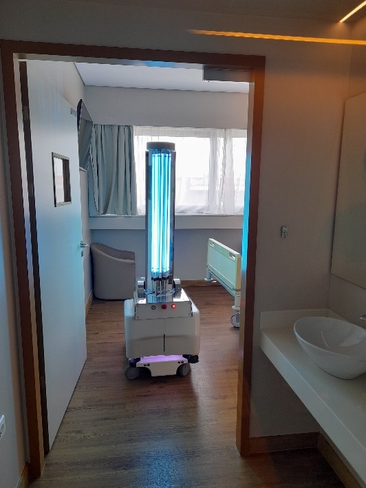 Επιπλέον, το σύστημα διαθέτει ρομποτική πλατφόρμα με τεχνητή νοημοσύνη που μπορεί να κινείται αυτόνομα σε εσωτερικούς χώρους, είναι ικανό να αποφεύγει εμπόδια και να επαναπρογραμματίσει τη διαδρομή του, προσφέροντας πιστοποιημένη και ποιοτική απολύμανση.