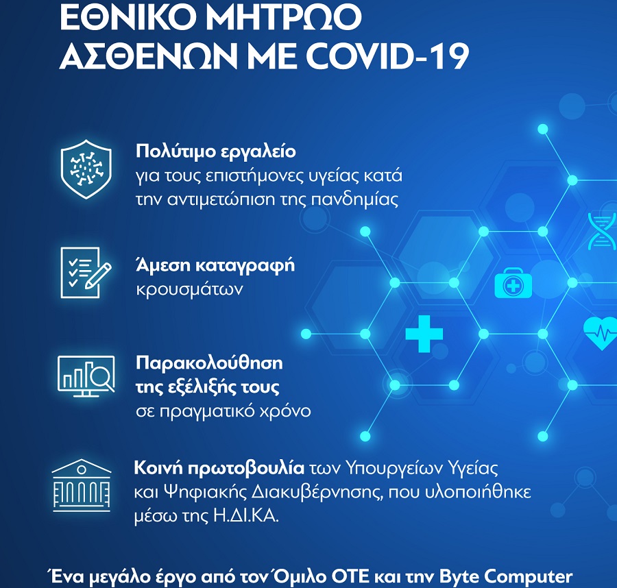 Το Εθνικό Μητρώο Ασθενών με COVID-19 υλοποίησε ο Όμιλος ΟΤΕ, σε συνεργασία με την εταιρεία Byte Computer, για το Υπουργείο Υγείας, μέσω της Ηλεκτρονικής Διακυβέρνησης Κοινωνικής Ασφάλισης (Η.ΔΙ.ΚΑ ΑΕ). Το πληροφοριακό σύστημα εξασφαλίζει την «ανωνυμοποίηση» των στοιχείων των ασθενών, σύμφωνα με το ελληνικό και ευρωπαϊκό δίκαιο για την προστασία των προσωπικών δεδομένων και αποτελεί πολύτιμο εργαλείο στα χέρια των επιστημόνων υγείας για την αντιμετώπιση της πανδημίας.