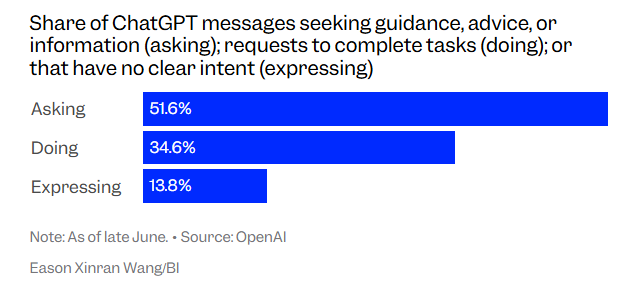 Η έρευνα της OpenAI, όπως αναφέρει το Business Insider, δείχνει ότι το ChatGPT είναι πιο δημοφιλές σε εργασίες όπως συγγραφή, επιμέλεια, σύνοψη και brainstorming. Μαθητές, marketers και knowledge workers το αξιοποιούν για εκθέσεις, αναφορές ή καμπάνιες, ενώ εκπαιδευτικοί το χρησιμοποιούν για κουίζ, διδασκαλία και απλοποίηση σύνθετων θεμάτων.