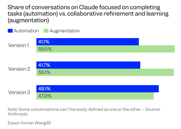 Η μελέτη της Anthropic δείχνει ότι το Claude χρησιμοποιείται εντονότερα σε software development και enterprise automation. Προγραμματισμός και μαθηματικές εργασίες καλύπτουν πάνω από το ένα τρίτο της χρήσης, με επιχειρήσεις να το ενσωματώνουν σε workflows για επεξεργασία εγγράφων, παραγωγή αναφορών και μαζικό coding. Πρόκειται για την τρίτη μελέτη της Anthropic, αλλά η πρώτη στην οποία η αυτοματοποίηση υπερέβη την ενίσχυση.