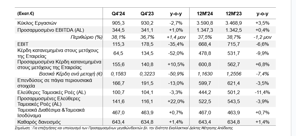 Το προσαρμοσμένο EBITDA (AL) του Ομίλου ανήλθε σε €344,5 εκατ., αυξημένο κατά 1%, υποστηριζόμενο κυρίως από την ανάπτυξη κατά 1,8% στην Ελλάδα. Το περιθώριο προσαρμοσμένου EBITDA (AL) του Ομίλου στο τρίμηνο ανήλθε σε 38,1% από 36,7% στο Δ’ τρίμηνο 2023.
