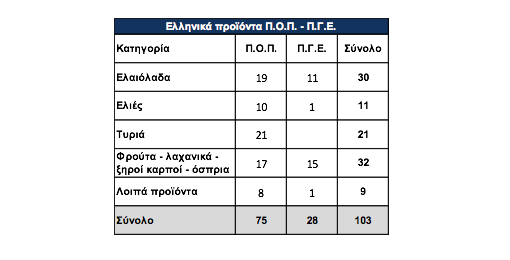 Η Ελλάδα, είναι η 5η κατά σειρά χώρα της Ευρωπαϊκής Ένωσης με επίσημα αναγνωρισμένα ως ελληνικά, 103 προϊόντα. Τα 75 από αυτά είναι Π.Ο.Π. και τα 28 Π.Γ.Ε. Στην πολυπληθέστερη κατηγορία ανήκουν τα φρούτα, τα λαχανικά, οι ξηροί καρποί & όσπρια με 32 προϊόντα, τα 30 είναι ελαιόλαδα τα 21 τυριά, τα 11 ποικιλίες ελιάς και τα 9 προϊόντα των υπολοίπων κατηγοριών.