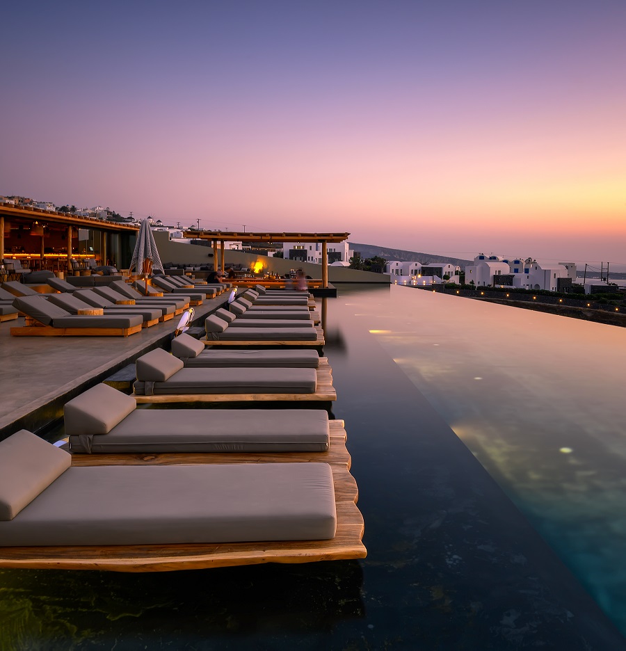 Το Pacman Sunset Bar Restaurant είναι ένας χώρος boho αισθητικής, που «κόβει την ανάσα» του επισκέπτη με την πρώτη ματιά. Βρίσκεται μπροστά από την ολοκαίνουργια επιβλητική Grande Pool του ξενοδοχείου, 1.115 τ.μ., ενώ στο φόντο κυριαρχεί το θρυλικό ηλιοβασίλεμα του νησιού, με τον ήλιο να χάνεται, κυριολεκτικά, μέσα στα καταγάλανα νερά του Αιγαίου.