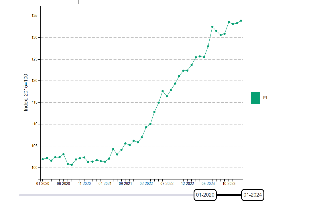 Στον παρακάτω πίνακα φαίνεται η πορεία της τιμής του ελαιόλαδου στη χώρα μας από τον Ιανουάριο του 2020 έως τον Ιανουάριο του 2024.