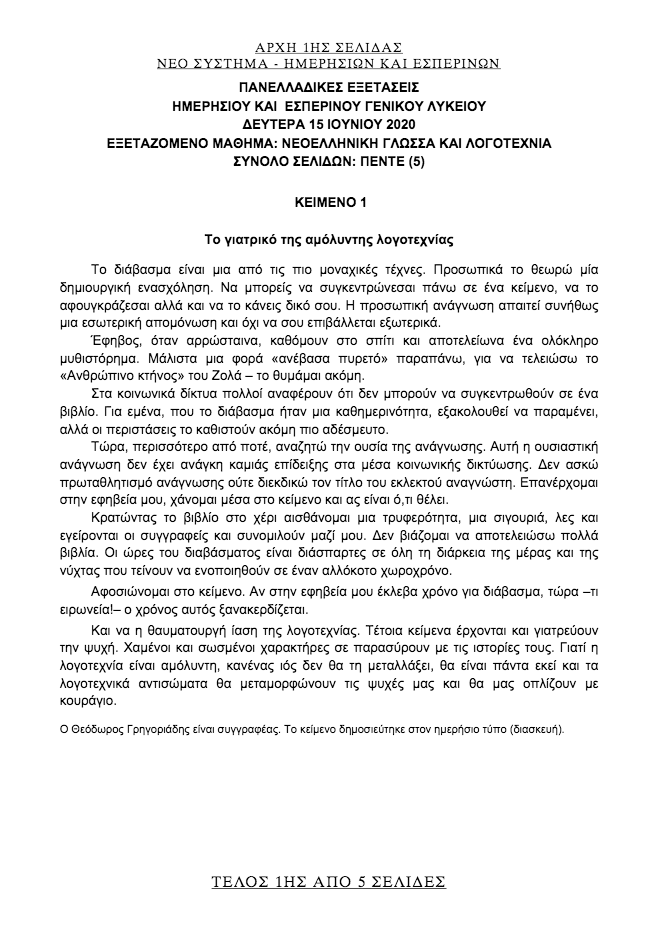 Πανελλήνιες 2020: Τα θέματα σε Νεοελληνική Γλώσσα και Λογοτεχνία