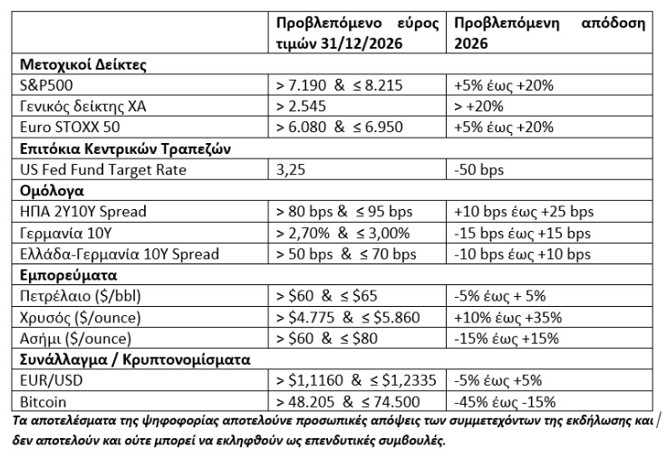 Η πλειοψηφία των συμμετεχόντων αναμένουν ότι ο Γενικός δείκτης του Χρηματιστηρίου Αθηνών θα προσεγγίσει επίπεδα υψηλότερα από 2.500 μονάδες στα τέλη του 2026, ενώ και οι δείκτες των Ευρωπαϊκών και των Αμερικανικών μετοχών θα κινηθούν επίσης ανοδικά. Αναλυτικά, οι προβλέψεις των συμμετεχόντων για την πορεία των αγορών μέχρι 31 Δεκεμβρίου 2026 φαίνεται ακολούθως: