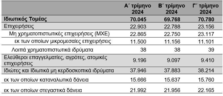 Η ονομαστική αξία των υπό διαχείριση δανείων προς ελεύθερους επαγγελματίες, αγρότες και ατομικές επιχειρήσεις αυξήθηκε κατά 313 εκατ. ευρώ έναντι του προηγούμενου τριμήνου και διαμορφώθηκε σε 9.410 εκατ. ευρώ στο τέλος του γ΄ τριμήνου του 2024.