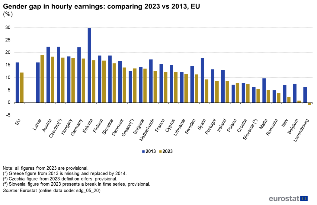 Το 2023, 24 από τις 27 χώρες της ΕΕ είδαν βελτιώσεις στο μη προσαρμοσμένο μισθολογικό χάσμα μεταξύ ανδρών και γυναικών σε σύγκριση με το 2013, με μειώσεις που κυμαίνονται από 0,3% στην Κροατία έως 12,9%. στην Εσθονία.