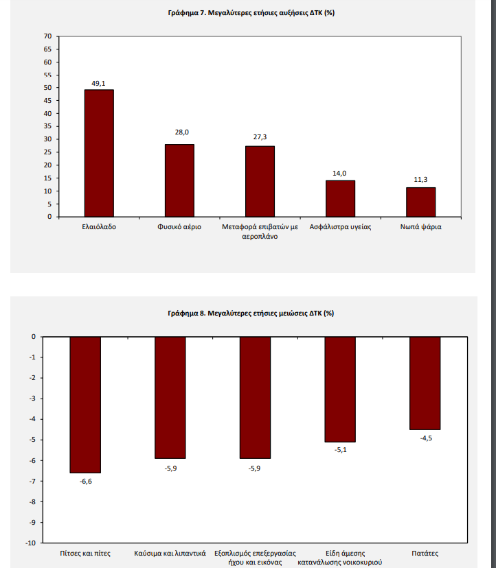 Σε ετήσιο επίπεδο, οι μεγαλύτερες αυξήσεις τιμών ανά κατηγορία σημειώθηκαν στο ελαιόλαδο (+49,1%), στο φυσικό αέριο (+28%) και στη μεταφορά επιβατών με αεροπλάνο (+27,3%).