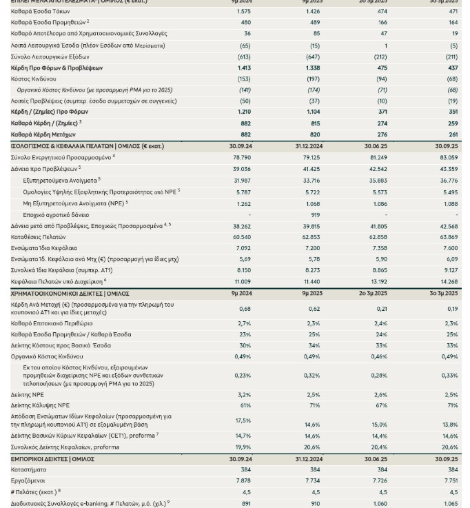 - €36,8 δισ. δάνεια, αυξημένα κατά €3,1 δισ. στο εννεάμηνο. Η ισχυρή επίδοση οδηγεί σε αναπροσαρμογή του στόχου για το 2025 σε άνω των €37,3 δισ. δανείων.