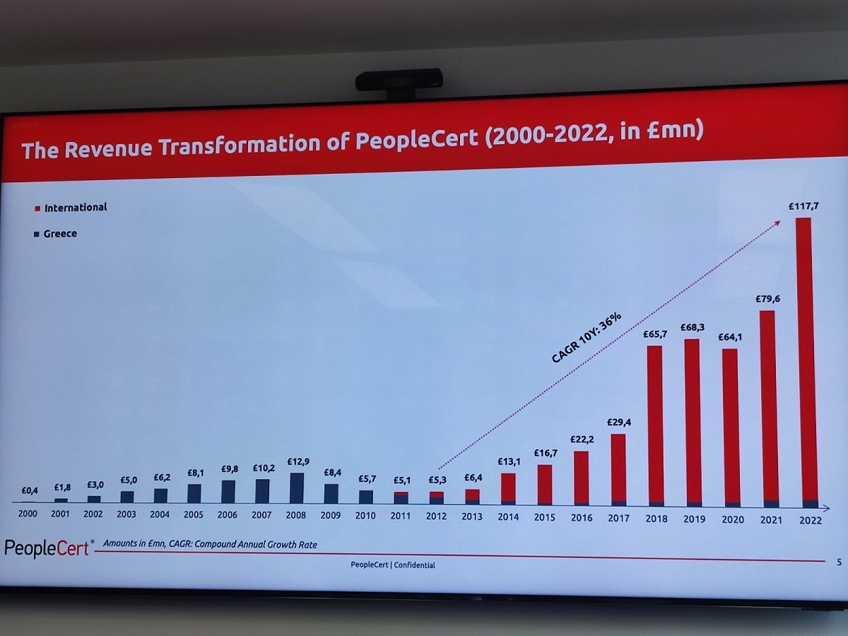 «Το 2022 ήταν πολύ καλύτερη χρονιά από τις προηγούμενες. Ο τζίρος μας ενισχύθηκε κατά 48% στα 138 εκατ. ευρώ, μια πραγματική αύξηση διαστρωματική από όλες τις πλευρές, ως αποτέλεσμα της εξαγοράς της AXELOS, όπου κλείσαμε στα 90 εκατ ευρώ. Πρόκειται για τις υψηλότερες πωλήσεις που έχουμε κάνει μέχρι σήμερα. Η γενικότερη εικόνα είναι ότι κάναμε μια πολύ μεγάλη εξαγορά που είναι και η μεγαλύτερη που έκανε ποτέ ελληνικός ιδιωτικός τομέα εκτός Ελλάδος μετά από την εξαγορά της Finance bank από την Εθνική Τράπεζα και την εξαγορά του ΟΤΕ Ρουμανίας από τον ΟΤΕ» ανέφερε ο Ιδρυτής της PeopleCert, Βύρων Νικολαϊδης, τονίζοντας ότι η εταιρεία του αποτελεί τον πρώτο ελληνικό μονόκερο.