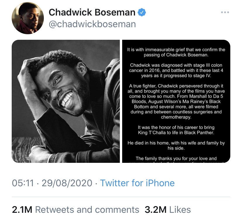 Ο Boseman πάλευε με τον καρκίνο το τελευταίο διάστημα, από τον οποίο και νικήθηκε, αφήνοντας την τελευταία του πνοή το βράδυ της Παρασκευής, με την οικογένειά του να γνωστοποιεί την απώλειά του μέσω Twitter.