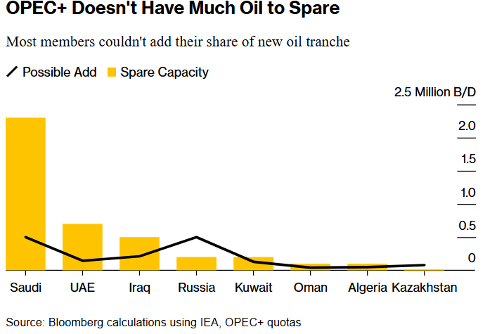 Σύμφωνα με υπολογισμούς του Bloomberg, που βασίζονται σε στοιχεία του IEA, ο ΟΠΕΚ+ διαθέτει πάνω από 3 εκατ. βαρέλια ημερησίως πλεονάζουσας παραγωγικής ικανότητας, συγκεντρωμένα κυρίως στη Σαουδική Αραβία, τα Ηνωμένα Αραβικά Εμιράτα και το Ιράκ. Η επαναφορά της παραγωγής κατά 1,66 εκατ. βαρέλια θα επέτρεπε την προσθήκη 730.000 βαρελιών από αυτούς, ενώ τα υπόλοιπα μέλη θα είχαν θεωρητικά το δικαίωμα να προσθέσουν 800.000 βαρέλια ημερησίως — χωρίς όμως να διαθέτουν την απαραίτητη χωρητικότητα για να το πετύχουν.