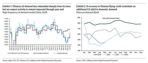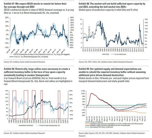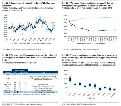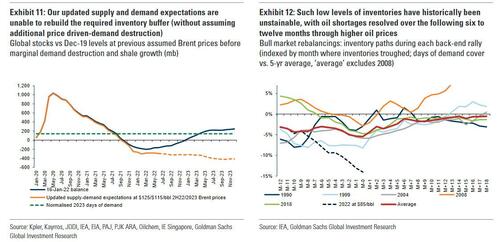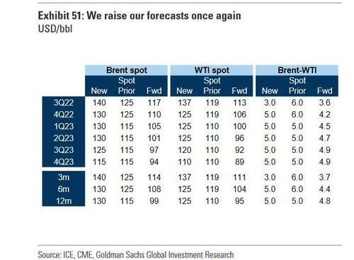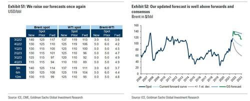 Με βάση την εκτιμώμενη ελαστικότητα ζήτησης (3%) που δίνει η Goldman και τη λογιστική αποσύνδεση της τιμής λιανικής έναντι του Brent, η τράπεζα προβλέπει ότι οι τιμές του πετρελαίου θα φτάσουν, κατά μέσο όρο, τα 135 δολ./βαρέλι το δεύτερο εξάμηνο του 2022 και 125 δολ./βαρέλι το 2023, δηλαδή 10 δολ./βαρέλι υψηλότερα από ό,τι στο παρελθόν.