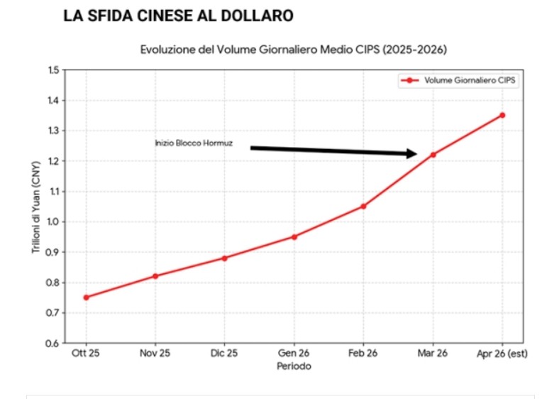 Σίγουρα, ο πλήρης αποκλεισμός των Στενών που επιβάλλουν τώρα οι Ηνωμένες Πολιτείες, ακόμη και σε νηοπομπές που έχουν εγκριθεί από την Τεχεράνη, καταργεί και το ίδιο το διόδιο που αμφισβητούσε την κυριαρχία του δολαρίου. Ωστόσο, το κινεζικό νόμισμα ως μέσο διεθνών πληρωμών φαίνεται να επωφελείται από τον τρίτο Πόλεμο του Περσικού Κόλπου, όπως δείχνει το παραπάνω γράφημα. Οι όγκοι διασυνοριακών εμπορικών συναλλαγών στο CIPS αυξάνονται από 619,7 δισεκατομμύρια γιουάν (91 εκατομμύρια δολάρια) ημερησίως τον Φεβρουάριο, σε 920,4 τον Μάρτιο, και σε 1.220 δισεκατομμύρια γουάν (178 εκατομμύρια δολάρια) αυτόν τον μήνα.