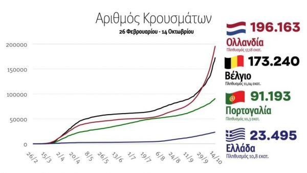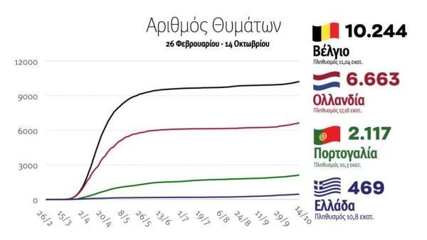 Συγκεκριμένα στο γράφημα με τον αριθμό των θυμάτων η Ελλάδα είναι τελευταία με 469 θύματα. Πρώτο έρχεται το Βέλγιο με 10.244 νεκρούς και ακολουθούν Ολλανδία και Πορτογαλία.