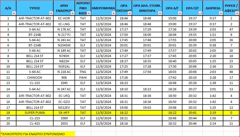 - Στις 12 Αυγούστου: 36 εναέρια μέσα (17 αεροσκάφη και 19 ελικόπτερα)