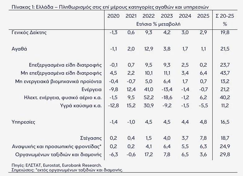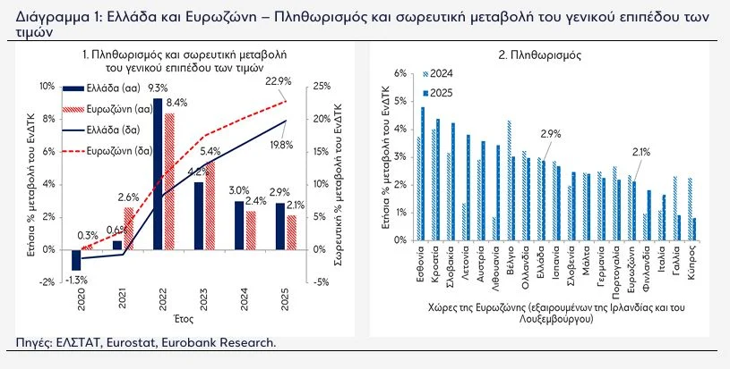 Ο πληθωρισμός στην Ελλάδα αποδείχθηκε επίμονος και το 2025, παραμένοντας στο 2,9% έναντι 3,0% το 2024, σύμφωνα με την ανάλυση «7 ΗΜΕΡΕΣ ΟΙΚΟΝΟΜΙΑ» της Eurobank. Οι πληθωριστικές πιέσεις προήλθαν κυρίως από τις υπηρεσίες, τα μη επεξεργασμένα τρόφιμα και την ενέργεια, ενώ η διεύρυνση της παραγωγικής βάσης μέσω ενίσχυσης της διαρθρωτικής ανταγωνιστικότητας αναδεικνύεται σε βασική προτεραιότητα για την αντιμετώπιση του φαινομένου και τη μείωση του ελλείμματος του ισοζυγίου τρεχουσών συναλλαγών.