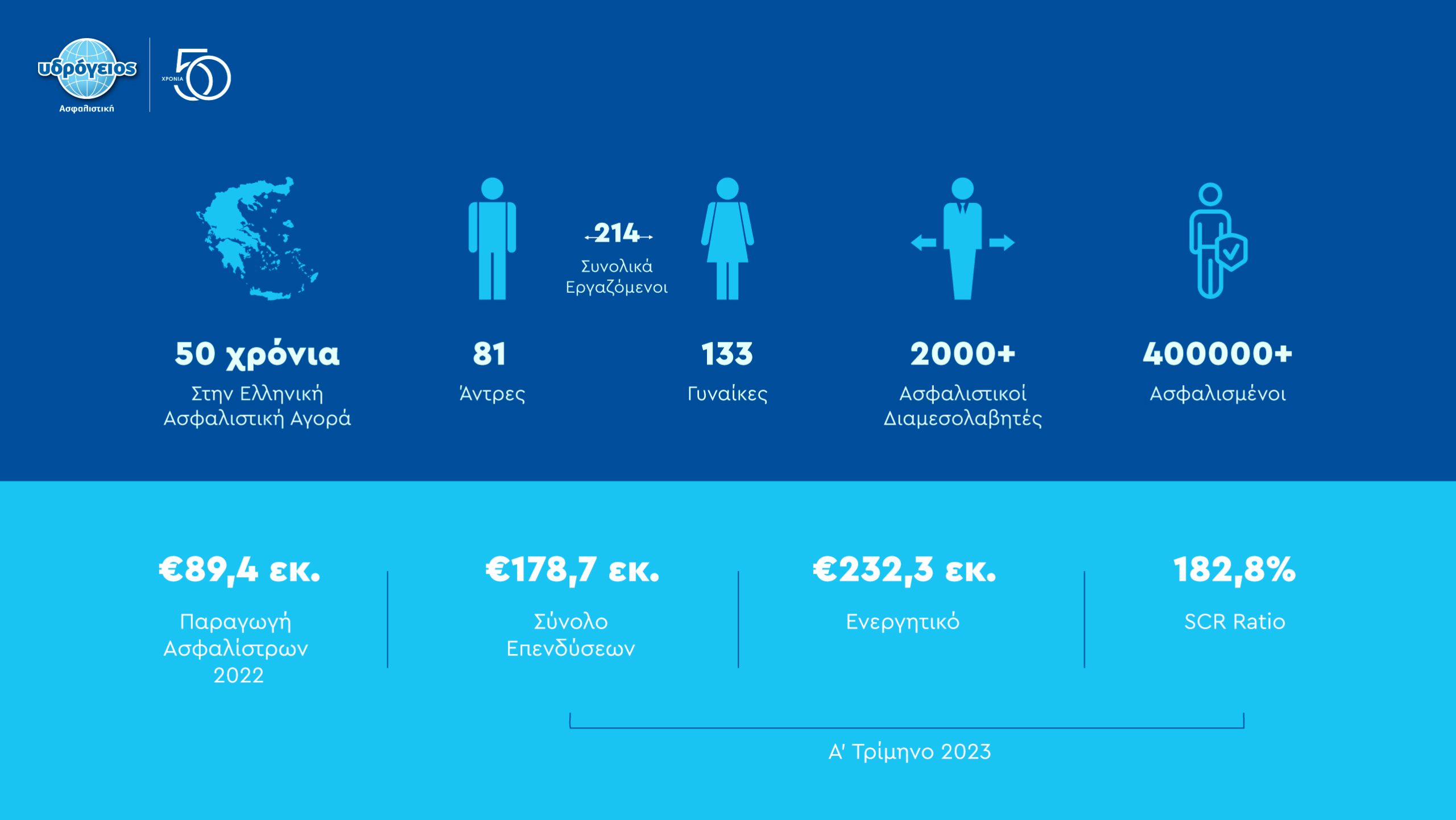 Ο Διευθύνων Σύμβουλος σημείωσε ότι στόχος της Εταιρείας είναι να συνεχίσει να προσφέρει καινοτόμες αλλά πάνω από όλα ανθρωποκεντρικές υπηρεσίες στους 400.000 ασφαλισμένους της, διεκδικώντας ταυτόχρονα μεγαλύτερο μερίδιο αγοράς στις ασφαλίσεις περιουσίας, αστικών ευθυνών και υγείας. Υπογράμμισε ότι η Υδρόγειος Ασφαλιστική είναι μία από τις μεγαλύτερες ασφαλιστικές εταιρείες στον κλάδο των Γενικών Ασφαλειών, με ενεργητικό που, στο πρώτο τρίμηνο του 2023, ανέρχεται σε €232,3εκ.. Τόνισε ότι κατά το ίδιο διάστημα, η εταιρεία ενίσχυσε περαιτέρω την κεφαλαιακή της επάρκεια, με αποτέλεσμα ο Δείκτης Κάλυψης Κεφαλαιακών Αναγκών (SCR Ratio), που αποτελεί ένα από τα ισχυρότερα κριτήρια φερεγγυότητας, να ανέρχεται σε 182,8%.