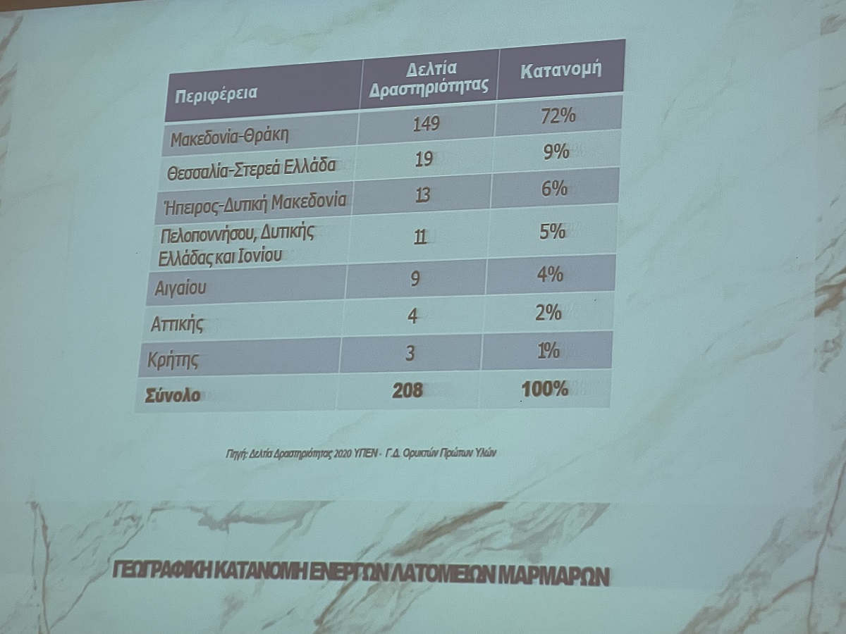 Στην καθιέρωση μιας ενιαίας ταυτότητας για το μάρμαρο και ενός ισχυρού brand name παγκοσμίως αναφέρθηκε η Πρόεδρος του Σ.Ε.Μ.Μ.Θ., Ιουλία Χαϊδά, τονίζοντας πως η εποχή επιτάσσει την αξιοποίηση των νέων τεχνολογικών εργαλείων. Διευκρίνισε πως από τα συνολικά 208 λατομεία μαρμάρου, τα 149 βρίσκονται στην ευρύτερη περιοχή της Μακεδονίας – Θράκης, στηρίζοντας σε μεγάλο βαθμό τις τοπικές οικονομίες.
