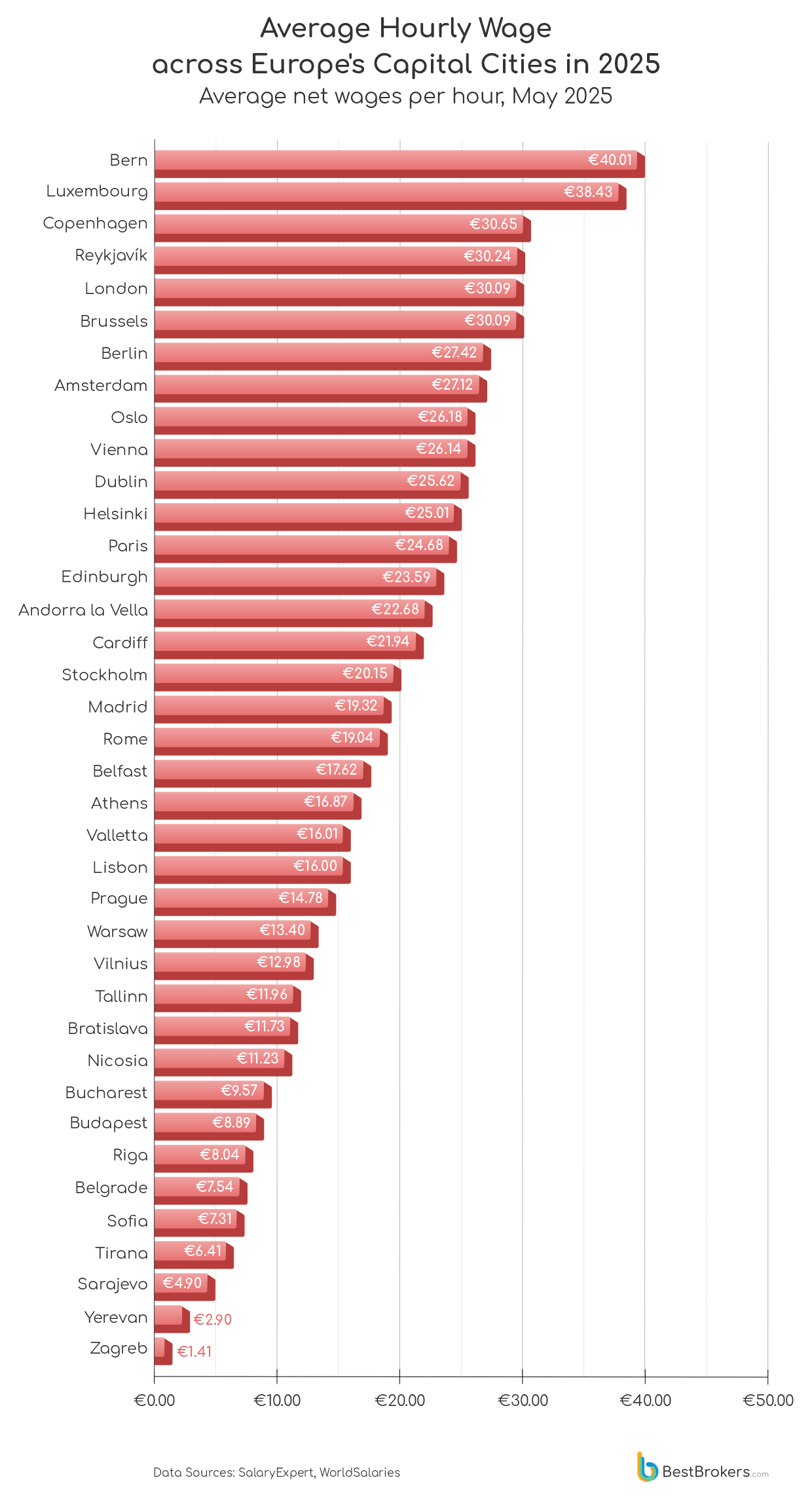 Στην κορυφή της λίστας βρίσκεται η Βέρνη της Ελβετίας με μέσο ωριαίο μισθό 40,01 €, ακολουθούμενη από το Λουξεμβούργο στα 38,43 € και την Κοπεγχάγη στα 30,65 €. Αντίθετα, οι χαμηλότεροι μισθοί βρίσκονται στο Ζάγκρεμπ στα 1,41 €, στο Ερεβάν στα 2,90 € και στο Σαράγεβο στα 4,90 €.
