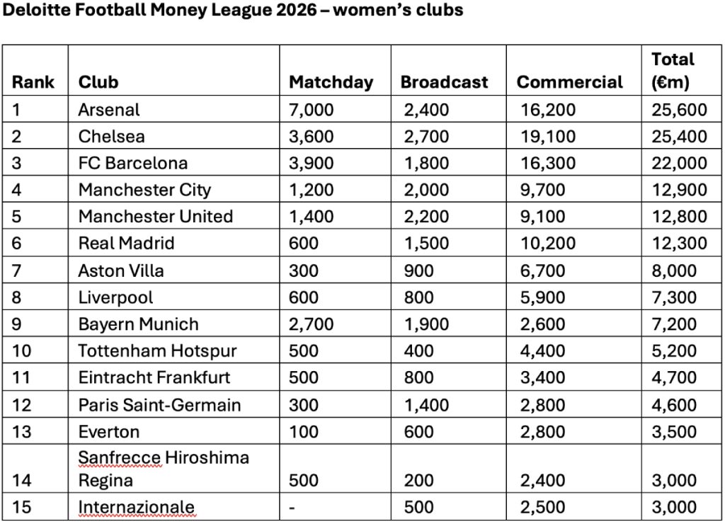 Η Άρσεναλ και η Τσέλσι είναι πλέον οι γυναικείες ομάδες με τα μεγαλύτερα έσοδα στον κόσμο, ξεπερνώντας τα €25 εκατ. η καθεμία, ενώ η Barcelona ακολουθεί με €22 εκατ. Στην πρώτη πεντάδα εισέρχονται επίσης οι Manchester City και Manchester United, με τους κορυφαίους 15 συλλόγους να ξεπερνούν για πρώτη φορά συνολικά τα €158 εκατ., σημειώνοντας αύξηση 34% σε σχέση με την προηγούμενη σεζόν.