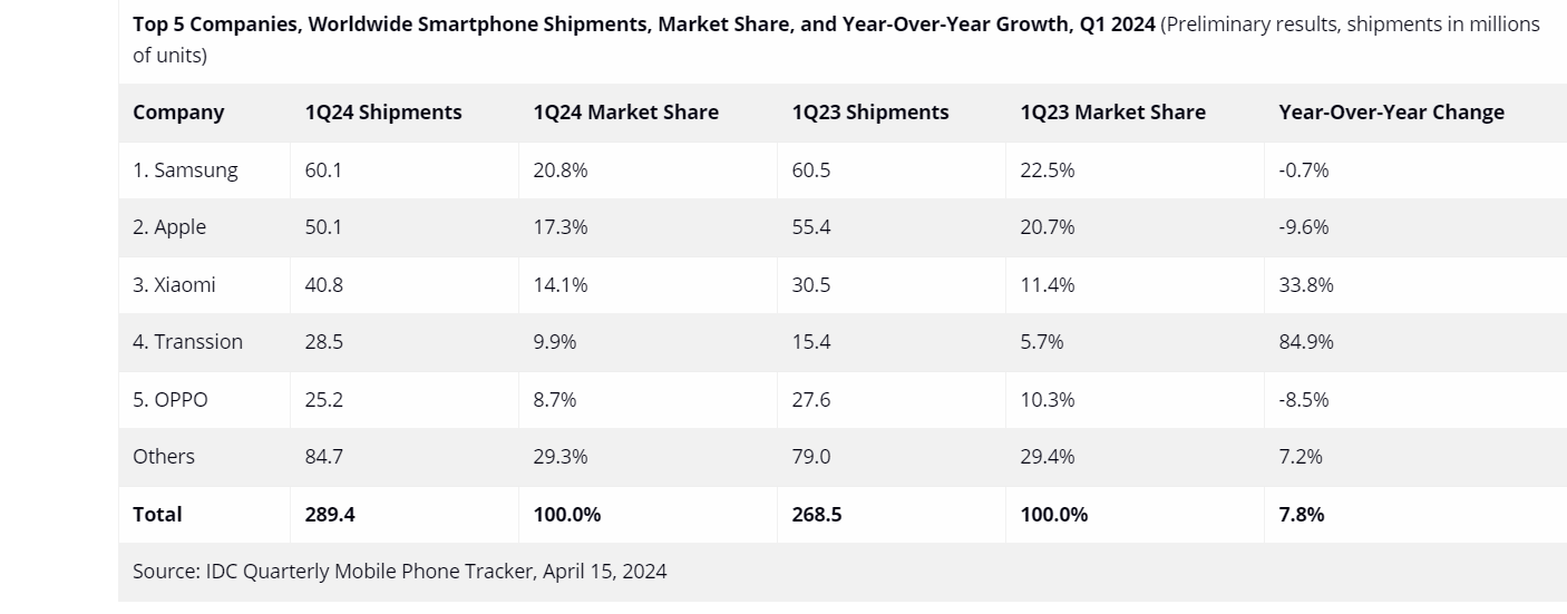 Η εταιρεία Shenzhen Transsion κατέλαβε την πρώτη θέση ως ο ταχύτερα αναπτυσσόμενος πωλητής smartphone στον κόσμο, σημειώνοντας αύξηση 84,9% στις πωλήσεις της, από 15,4 εκατομμύρια το πρώτο τρίμηνο του 2023 σε 28,5 εκατομμύρια το πρώτο τρίμηνο του 2024.