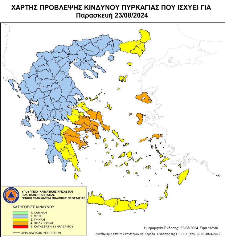 Σύμφωνα με το Χάρτη Πρόβλεψης Κινδύνου Πυρκαγιάς που εκδίδει η Γενική Γραμματεία Πολιτικής Προστασίας του Υπουργείου Κλιματικής Κρίσης & Πολιτικής Προστασίας (civilprotection.gov.gr), για σήμερα, Παρασκευή 23 Αυγούστου 2024, προβλέπεται: