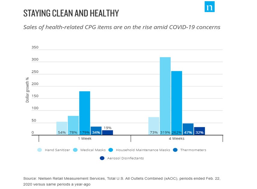 Έρευνα της Nielsen, έχει ήδη καταγράψει την τάση των καταναλωτών σε πολλές χώρες του κόσμου να αποθεματοποιούν είδη προληπτικής προστασίας, όπως μάσκες προστασίας και απολυμαντικά τζελ, καθώς επίσης και βασικά προϊόντα διατροφής, όπως είναι τα κονσερβοποιημένα τρόφιμα, το αλεύρι, η ζάχαρη και το εμφιαλωμένο νερό. Ταυτόχρονα οι καταναλωτές προσπαθούν να θωρακίσουν την υγεία τους αυξάνοντας τις αγορές φρέσκων φρούτων και λαχανικών, βιταμινών, καθώς και συμπληρωμάτων διατροφής.