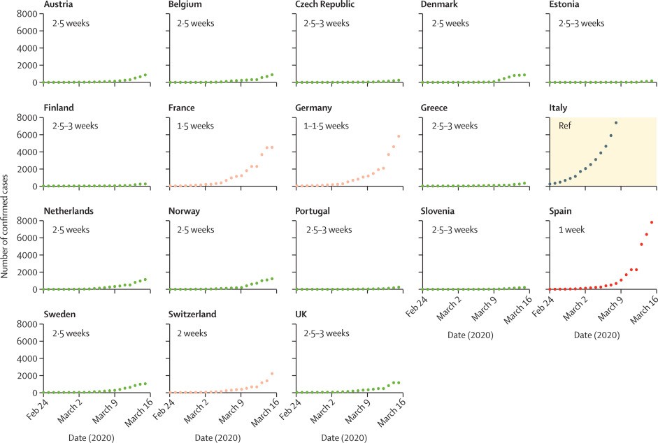 Όλες οι άλλες Ευρωπαϊκές χώρες φαίνεται να βρίσκονται σε αντίστοιχη κατάσταση, αλλά με καθυστέρηση μερικών εβδομάδων συγκριτικά με την Ιταλία (Εικόνα). Οι συντάκτες του άρθρου τονίζουν ότι όλες οι χώρες πρέπει να λάβουν σοβαρά υπόψη την πορεία της Ιταλίας και να λάβουν δραστικότατα μέτρα κοινωνικής απομόνωσης ώστε να μειωθεί η εξάπλωση της λοίμωξης, να διασφαλίσουν την αποτελεσματική αντίδραση των συστημάτων υγείας και να μειώσουν τη θνησιμότητα που στην Ιταλία ανέρχεται στο 4%.