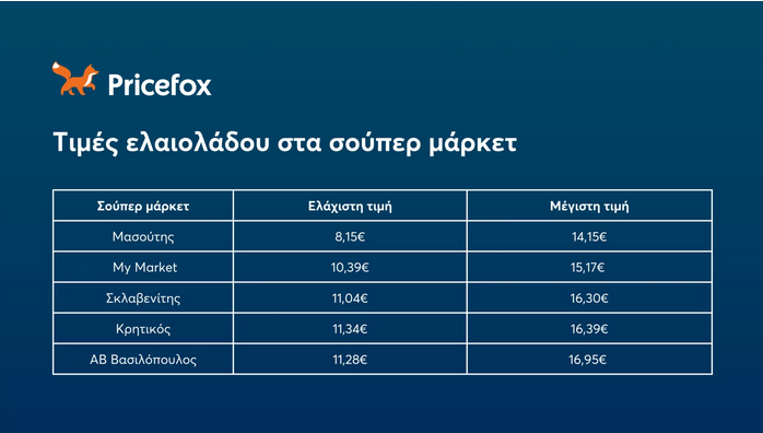 Η αλυσίδα που προσφέρει τις πιο οικονομικές επιλογές είναι ο Μασούτης, όπου οι τιμές του ελαιολάδου κυμαίνονται από 8,15 ευρώ έως 14,15 ευρώ ανά λίτρο, ανάλογα με τη μάρκα. Τα καταστήματα My Market και Σκλαβενίτης προσφέρουν τιμές κοντά στο μέσο όρο της αγοράς, με την τιμή να κυμαίνεται κάτω από τα 13 ευρώ για τα περισσότερα προϊόντα. Αντίθετα, οι αλυσίδες ΑΒ Βασιλόπουλος και Κρητικός εμφανίζουν τις υψηλότερες τιμές στην αγορά, με τις τιμές να ξεπερνούν τα 16 ευρώ ανά λίτρο για ορισμένα προϊόντα.