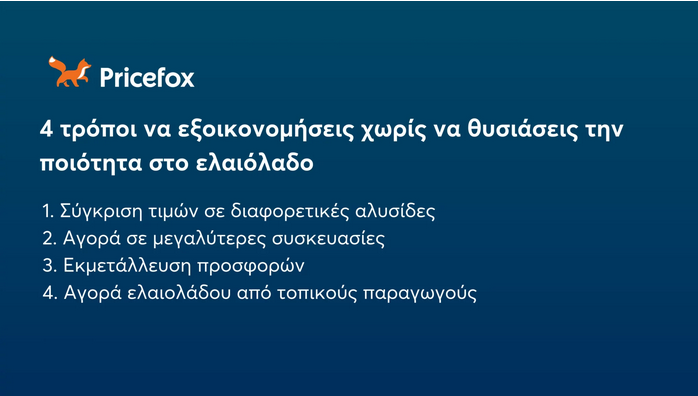 Για να εξοικονομήσουν χρήματα, οι καταναλωτές μπορούν να ακολουθήσουν μερικές στρατηγικές χωρίς να θυσιάσουν την ποιότητα του ελαιολάδου που αγοράζουν. Ο πρώτος τρόπος είναι η σύγκριση τιμών μεταξύ διαφορετικών αλυσίδων σούπερ μάρκετ. Οι διαφορές τιμών σε κάθε αλυσίδα και εντός των ίδιων καταστημάτων δίνουν πολλές επιλογές στους καταναλωτές και δημιουργούν ευκαιρίες εξοικονόμησης. Επίσης, η αγορά μεγαλύτερων συσκευασιών (όπως 3 λίτρων ή άνω) είναι συνήθως πιο οικονομική, καθώς η τιμή ανά λίτρο είναι χαμηλότερη σε σχέση με τις μικρότερες συσκευασίες. Εάν μια οικογένεια καταναλώνει τακτικά ελαιόλαδο, αυτή η στρατηγική μπορεί να μειώσει το κόστος σε βάθος χρόνου. Αξιοσημείωτο είναι ότι οι μεγαλύτερες συσκευασίες, αν αποθηκευτούν σε δροσερό και σκιερό μέρος, διατηρούν την ποιότητά τους για μεγαλύτερο χρονικό διάστημα. Επίσης, η αγορά από τοπικούς παραγωγούς είναι μια εξαιρετική επιλογή, καθώς το ελαιόλαδο που πωλείται απευθείας από τους παραγωγούς είναι συνήθως πιο φθηνό και εξαιρετικής ποιότητας.