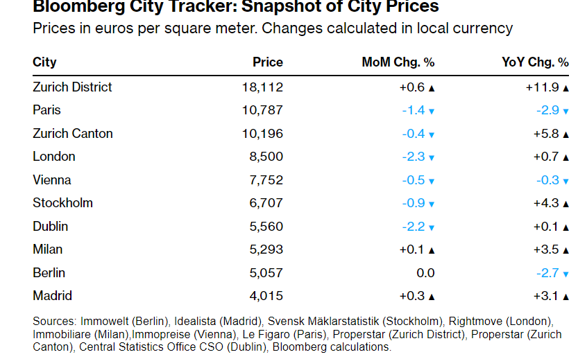 Η Ζυρίχη έχει «εκτοξευτεί» στην πρώτη θέση μεταξύ των μεγάλων πόλεων της Ευρώπης με τις ακριβότερες τιμές κατοικιών, σύμφωνα με το Bloomberg, ξεπερνώντας -κατά πολύ- το Λονδίνο και το Παρίσι.