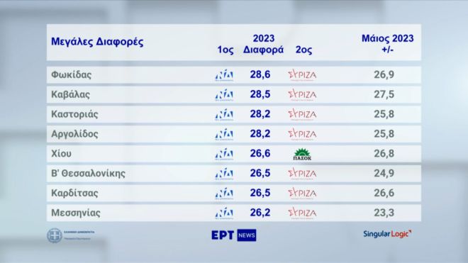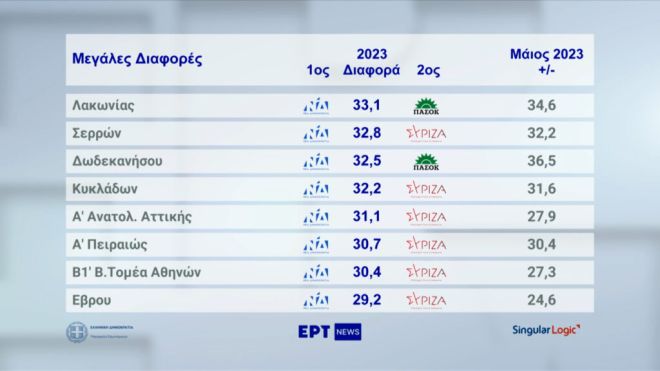 Στη Λακωνία σημειώθηκε η μεγαλύτερη διαφορά μεταξύ του Πρώτου και του Δεύτερου κόμματος στην επικράτεια με εντυπωσιακή διαφορά 33,1 μονάδων και ακολουθούν οι Σέρρες και τα Δωδεκάνησα. Αλλά και στην Ανατολική Αττική είναι εντυπωσιακή η διαφορά του Πρώτου και του Δεύτερου κόμματος.