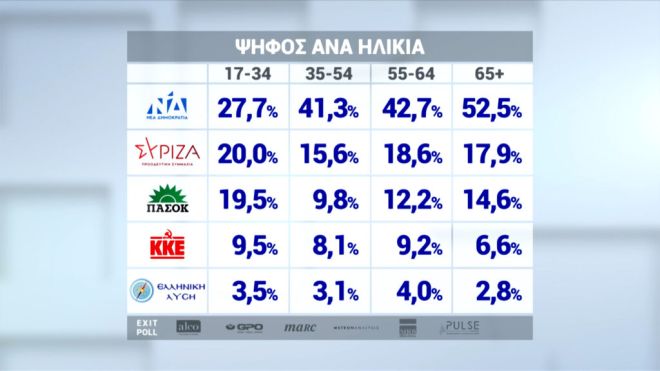 Ένας στους δύο (52,5%) άνω των 64 ετών ψήφισε ΝΔ στις εκλογές της Κυριακής και ακολούθησαν ΣΥΡΙΖΑ 17,9%, ΠΑΣΟΚ 14,6%, ΚΚΕ 6,6%, Ελληνική Λύση 2,8%, ΝΙΚΗ 1%, και Πλεύση Ελευθερίας, ΜεΡΑ25 και Σπαρτιάτες από 1,3%.