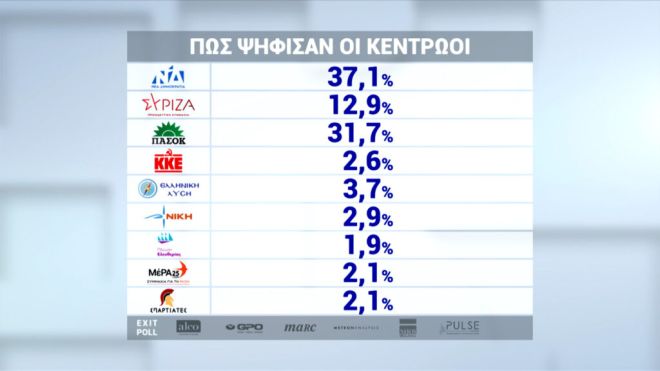 Παραπάνω από ένας στους τρεις ψηφοφόρους που αυτοπροσδιορίζονται ως κεντρώοι στήριξαν τον Κυριάκο Μητσοτάκη ενώ στη συγκεκριμένη κατηγορία που αναλύθηκε από το exit poll δεύτερο κόμμα αναδείχθηκε το ΠΑΣΟΚ με 31,7% με τον ΣΥΡΙΖΑ να καταγράφει μόλις 12,9%. Το εντυπωσιακό είναι ότι το ΠΑΣΟΚ είναι τρεις φορές πάνω από τον ΣΥΡΙΖΑ σε αυτούς που δηλώνουν κεντρώοι