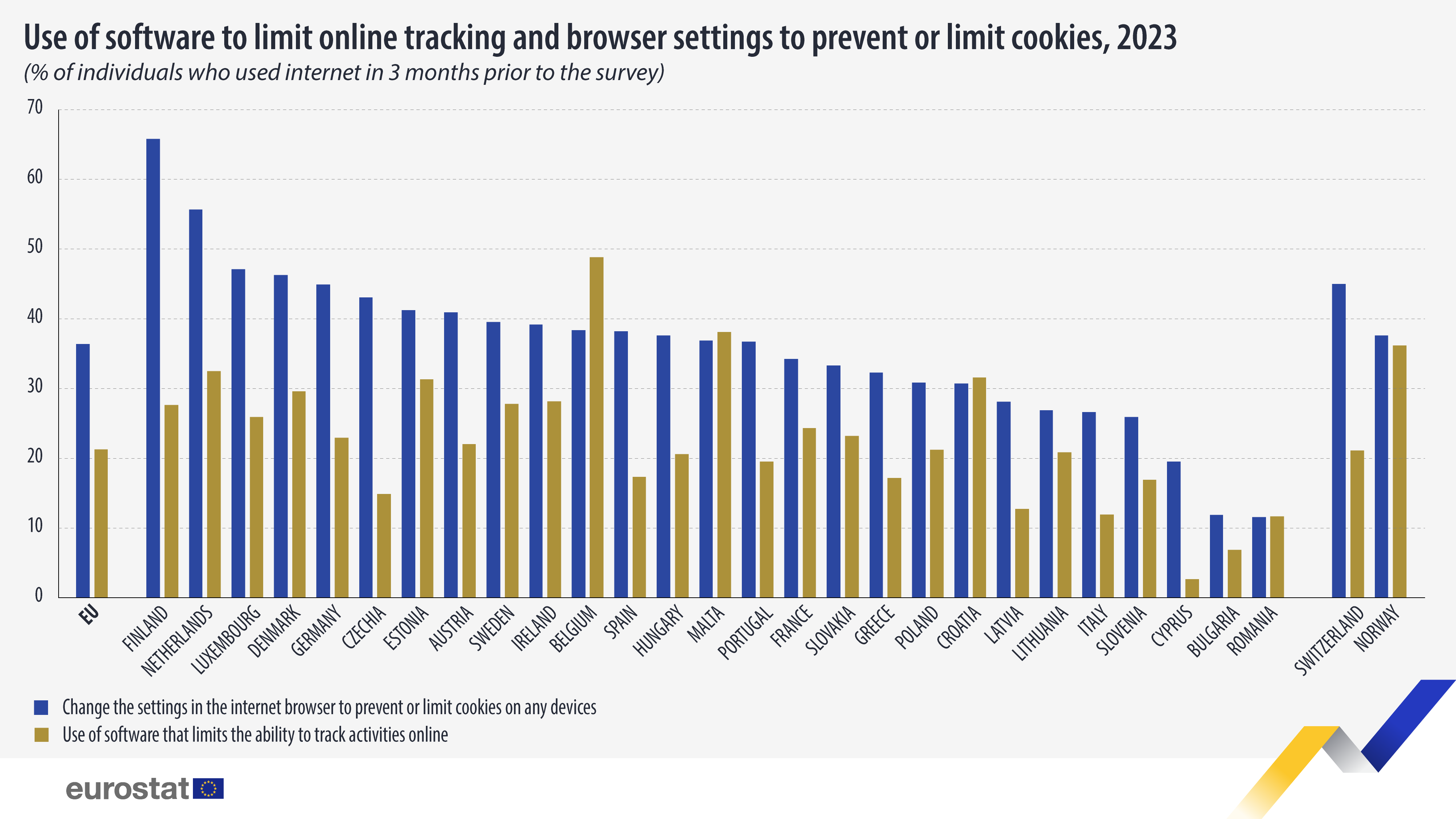 Μεταξύ των χωρών της ΕΕ, σχεδόν οι μισοί χρήστες του διαδικτύου στο Βέλγιο ήταν επιφυλακτικοί όσον αφορά την παρακολούθηση στο διαδίκτυο, με το 49% να χρησιμοποιεί λογισμικό για να περιορίσει τη δυνατότητα παρακολούθησης των δραστηριοτήτων στο διαδίκτυο. Ακολουθούν οι χρήστες στη Μάλτα (38%), την Ολλανδία και την Κροατία (και οι δύο 32%) και την Εσθονία (31%).