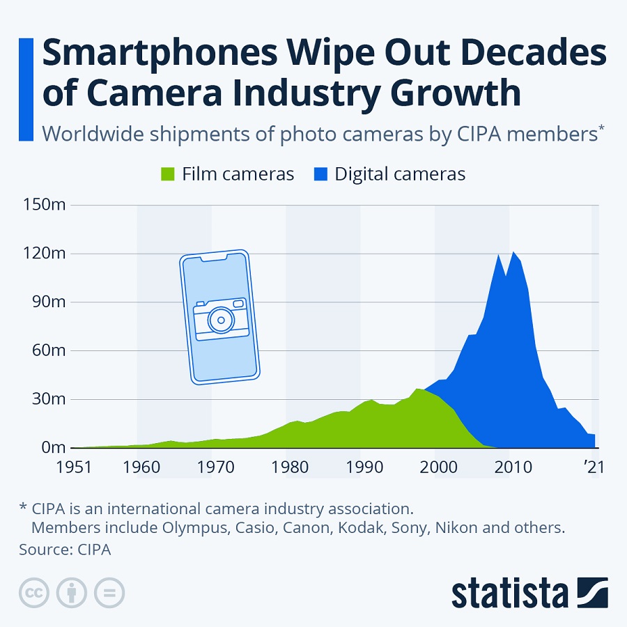 Όμως για τη βιομηχανία φωτογραφικών μηχανών και φωτογραφικού εξοπλισμού, η τεχνολογική εξέλιξη των smartphone είχε καταστροφικά αποτελέσματα. Σύμφωνα με τον CIPA, βιομηχανικό όμιλο με έδρα την Ιαπωνία με μέλη όπως η Olympus, η Canon και η Nikon, οι παγκόσμιες αποστολές καμερών μειώθηκαν κατά 93% μεταξύ 2010 και 2021, εξαλείφοντας δεκαετίες ανάπτυξης. Η απότομη πτώση προήλθε κυρίως από τη μείωση των αποστολών ψηφιακών φωτογραφικών μηχανών με ενσωματωμένους φακούς, τον τύπο στον οποίο βασίζονταν οι περιστασιακοί φωτογράφοι πριν από την άνοδο της φωτογραφίας smartphone.