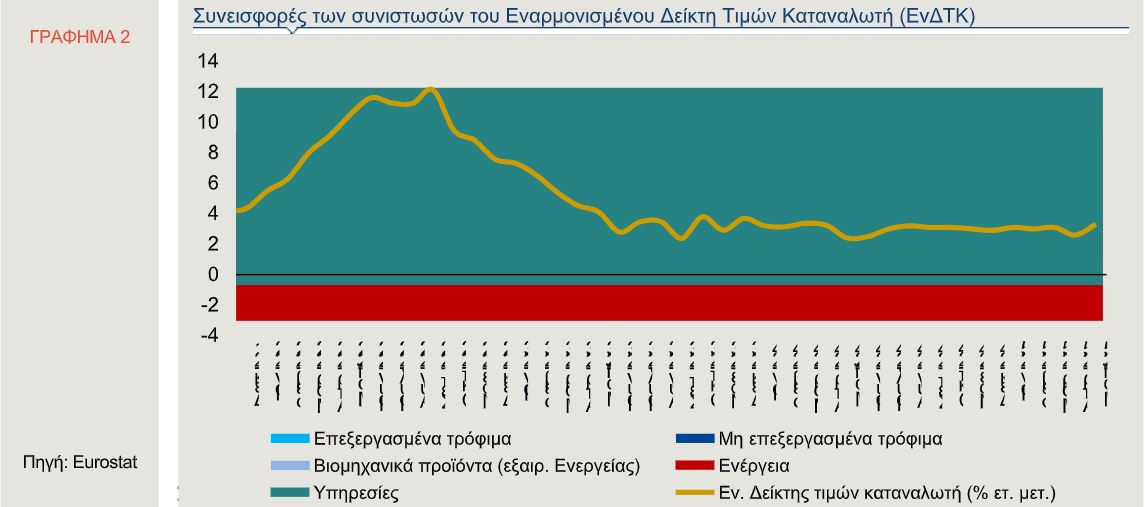 Όσον αφορά στον πληθωρισμό στην Ελλάδα με βάση τον Εναρμονισμένο Δείκτη Τιμών Καταναλωτή (ΕνΔΤΚ), το πρώτο πεντάμηνο του 2025 παρέμεινε στην περιοχή του 3% (Γράφημα 2) οριακά χαμηλότερα από το ίδιο διάστημα του 2024 (3,1%), ενώ τον Μάιο αυξήθηκε σε 3,3% από 2,6% τον προηγούμενο μήνα. Η κατηγορία που διατηρεί τον πληθωρισμό σε αυτό το επίπεδο είναι οι υπηρεσίες, οι οποίες συνέβαλαν περισσότερο από το 80% της ανόδου του δείκτη. Η συμβολή των μη επεξεργασμένων τροφίμων διαμορφώθηκε κατά μέσο όρο από την αρχή του έτους σε 0,3 ποσοστιαίες μονάδες (π.μ.), ενώ των βιομηχανικών προϊόντων εξαιρουμένης της ενέργειας αντίστοιχα, σε 0,2 π.μ. Η συνιστώσα του πληθωρισμού που περιλαμβάνει τα προϊόντα ενέργειας αλλά και τα επεξεργασμένα τρόφιμα δεν επηρέασαν τον ΕνΔΤΚ, καθώς οι τιμές σε αυτές τις δύο κατηγορίες προϊόντων παρέμειναν στα ίδια επίπεδο με το αντίστοιχο περυσινό διάστημα. Υπενθυμίζεται ότι τα χρόνια που ακολούθησαν την ενεργειακή κρίση η πτώση των τιμών της ενέργειας αντιστάθμισε μερικώς την άνοδο του γενικού επιπέδου τιμών αν και η αρνητική συμβολή ήταν οριακή το 2024.