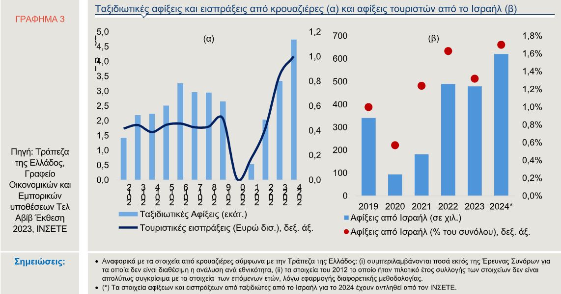 Άμεσες επιδράσεις: αν και οι ταξιδιωτικές αφίξεις από το Ισραήλ αυξήθηκαν κατά σχεδόν 30% το 2024 ανερχόμενες σε 621 χιλ., το μερίδιό τους επί του συνόλου ήταν σχετικά περιορισμένο, καθώς διαμορφώθηκε σε 1,7%, (Γράφημα 3β). Παράλληλα, οι αντίστοιχες ταξιδιωτικές εισπράξεις ανήλθαν σε Ευρώ 419 εκατ. το 2024, από Ευρώ 269 εκατ. το 2023. Οι δυνητικές απώλειες για τη φετινή χρονιά ενδέχεται να είναι υψηλότερες εάν δεν αποκατασταθούν άμεσα οι αεροπορικές συνδέσεις. Στα τέλη Απριλίου η διαθεσιμότητα αεροπορικών θέσεων με βάση τις προγραμματισμένες εισερχόμενες πτήσεις από το Ισραήλ, για τη θερινή περίοδο (Μάρτιος-Οκτώβριος), ανήλθαν σε 1,3 εκατ. θέσεις (+43,5%), αντιπροσωπεύοντας το 4,7% του συνόλου, ενώ οι ενεργές κρατήσεις αεροπορικών θέσεων αυξήθηκαν κατά περίπου 57%. Σημειώνεται ότι η Ελλάδα διατηρεί σε γενικές γραμμές πλεόνασμα και στο ισοζύγιο υπηρεσιών με το Ισραήλ, το οποίο αποδίδεται κυρίως στον τουρισμό και ανήλθε το 2023 σε Ευρώ 0,43 δισ.